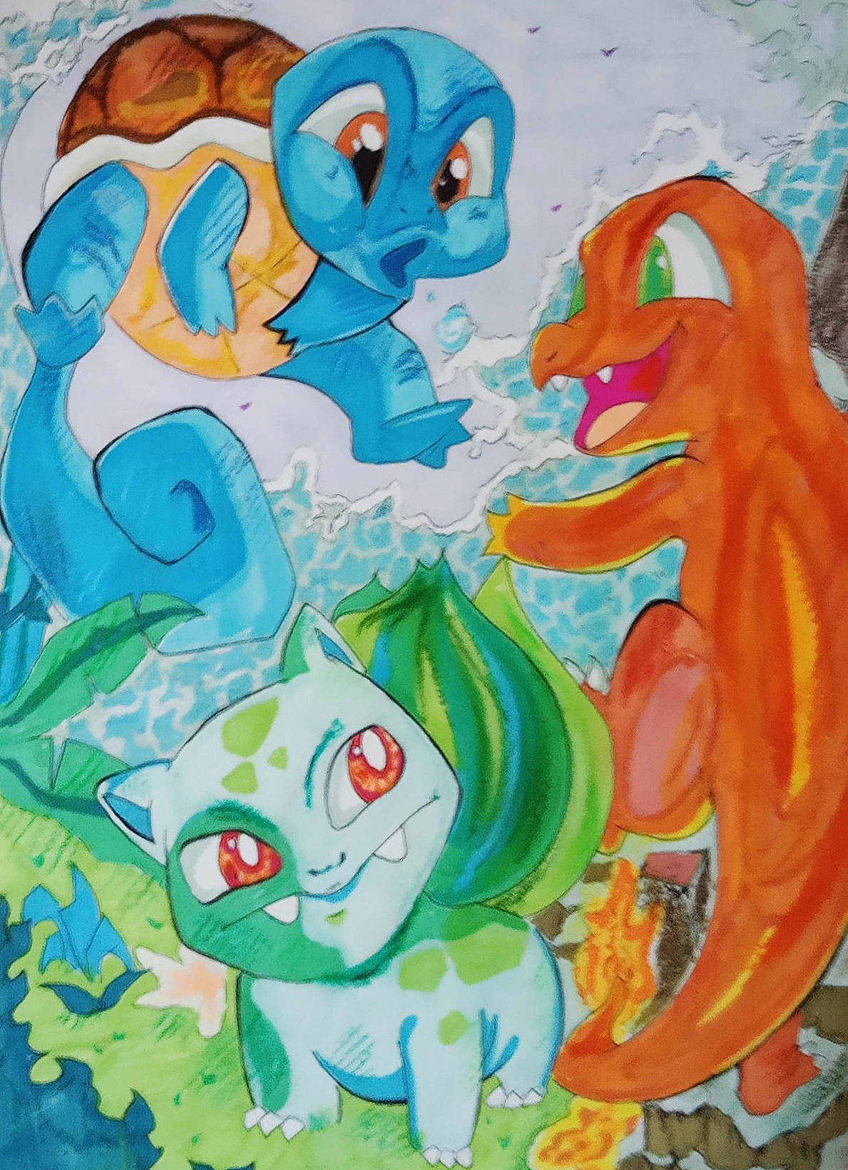 Ilustración de Bulbasur , Charmander y Squirtle conviviendo en diferentes paisajes/zonas como amigos y compañeros